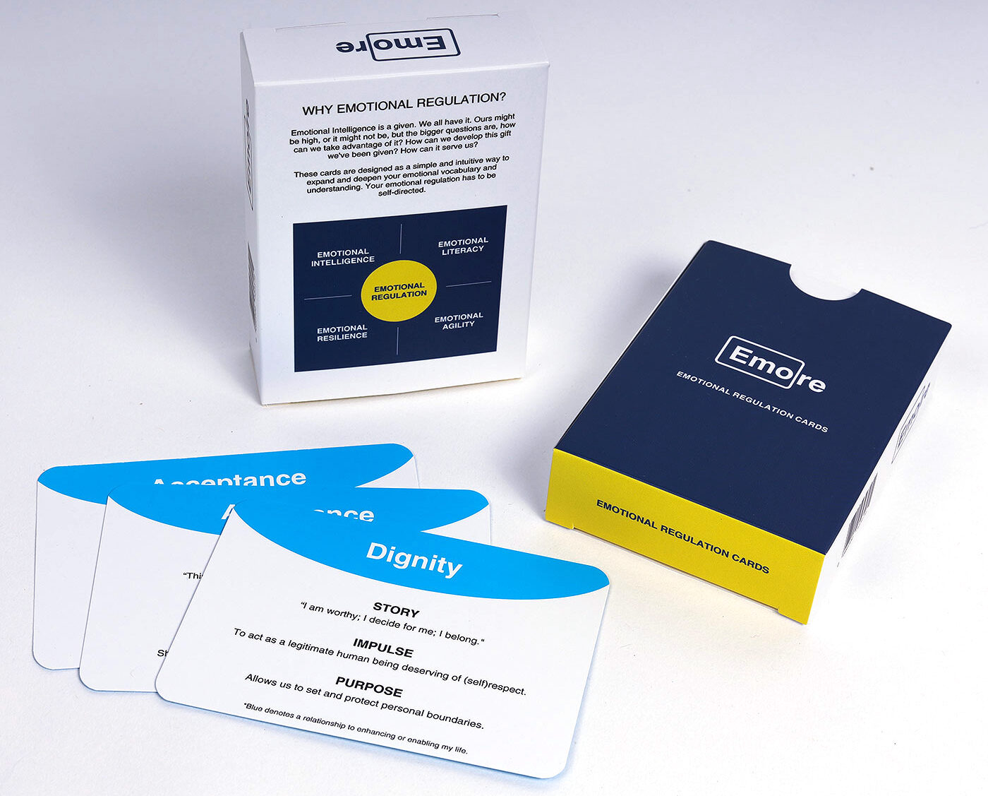 EMORE cards can be used to identify an emotion you have difficulty naming, to build your emotional vocabulary and understanding, or to set an emotional intention for your day. Use them to explore and experiment with your emotional understanding. This is key to developing emotional regulation.